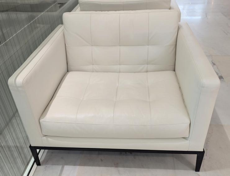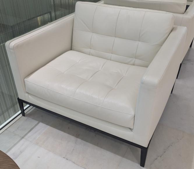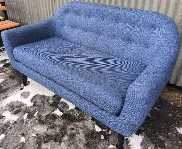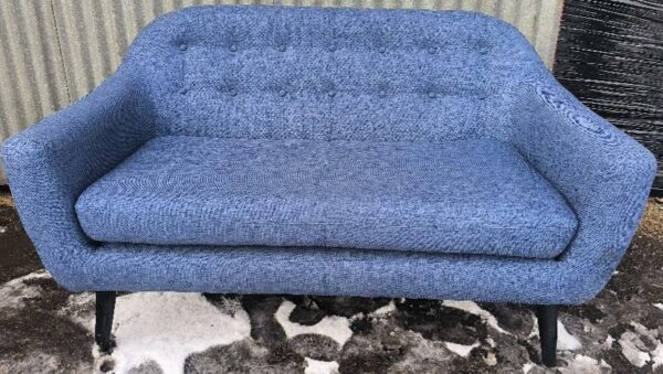 Canapé recouvert de tissu capitonné couleur bleu, piétement en bois noir, coussin d’assise amovible. Dim : 80 x 145 x 80 cm.