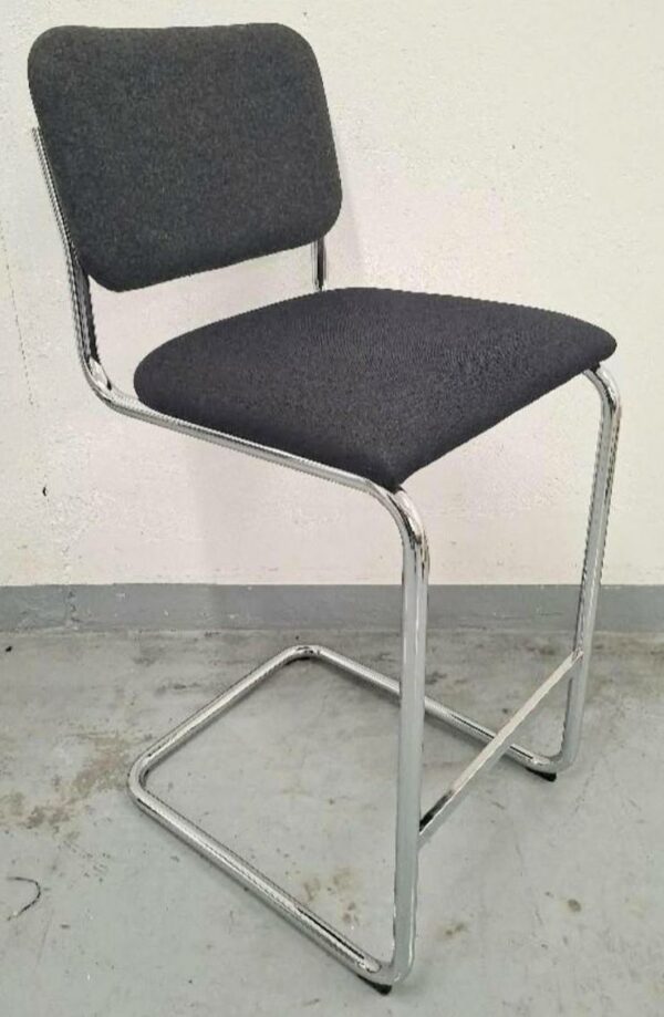Chaise haute design Marcel Breuer modèle Cesca édition Knoll, dossier en feutrine gris anthracite, assise en tissu noir, armature en acier chromé. 107 x 48 x 50 cm. 4 unités. Vendu à l’unité avec faculté de réunion.